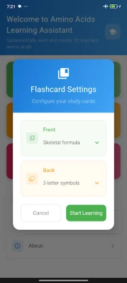 Customizable Settings: Tailor your learning experience by selecting specific amino acids for flashcards and quizzes, ensuring focused study sessions.