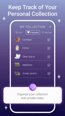 - Add photos of your own crystals, rocks, and gemstones, and organize them into Owned, Favorites, and Wishlist.