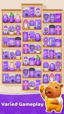 Match and organize cute 3D goods — from snacks and drinks to household items.