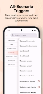 • Multi-Trigger Support: Time, location, app events, WiFi, Bluetooth, sensors